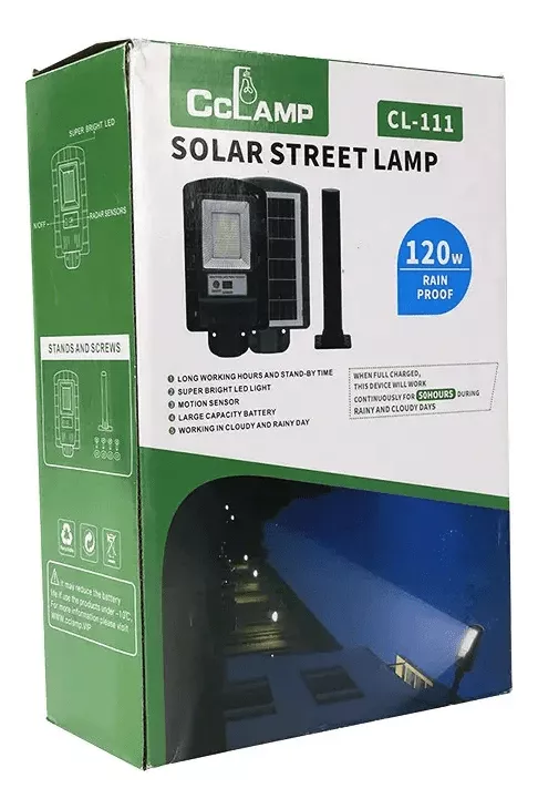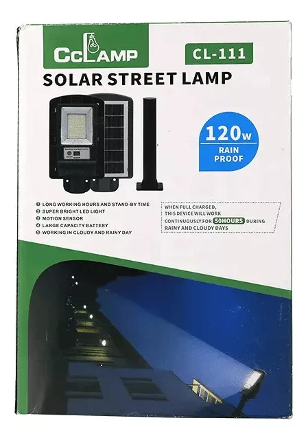 Esta lámpara solar exterior recargable CL-111 de 120W Clamp es un dispositivo de iluminación diseñado para uso en exteriores. Funciona con energía solar, lo que significa que se carga durante el día mediante paneles solares integrados y se enciende automáticamente al anochecer.